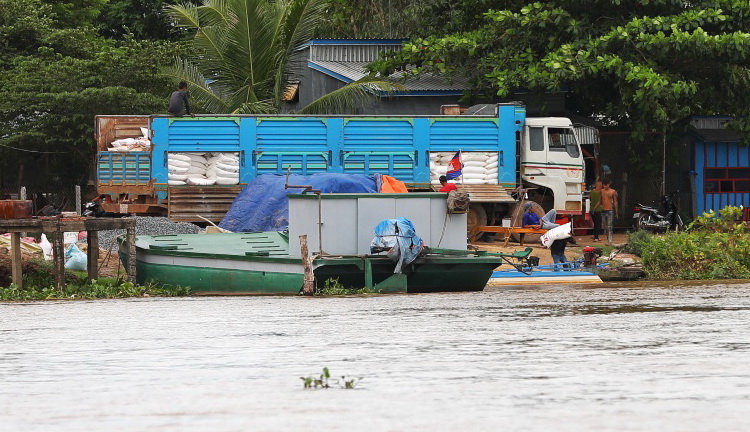 Chiếc xe tải khủng chở đường cát trắng tập kết phía đất bạn Campuchia để vận chuyển từng bao đường xuống xuồng đưa sang Việt Nam - Ảnh: Hữu Khoa